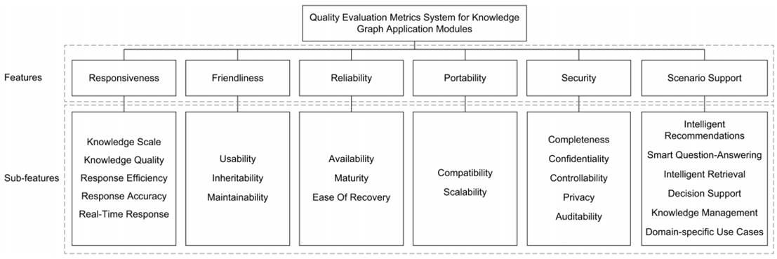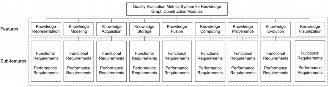 该标准定义了知识图谱的技术要求、性能指标、评估标准和测试用例。其中,强制性测试用例包括数据输入、元数据、数据提取、数据融合、数据存储与检索、推理分析以及知识图谱展示。这项标准可应用于各个计划、设计、开发、实施和应用知识图谱的组织,也适合为知识图谱开发支撑技术、工具和服务的组织所使用。图3是该标准定义的知识图谱评估指标体系。