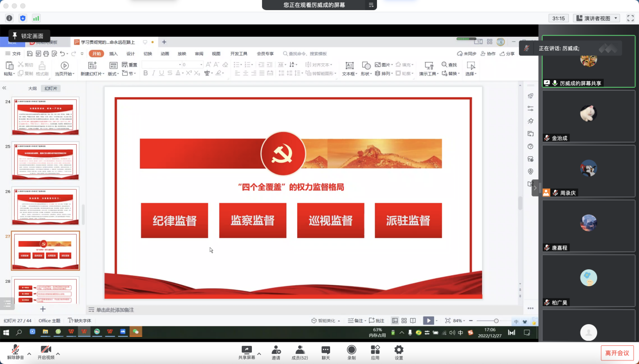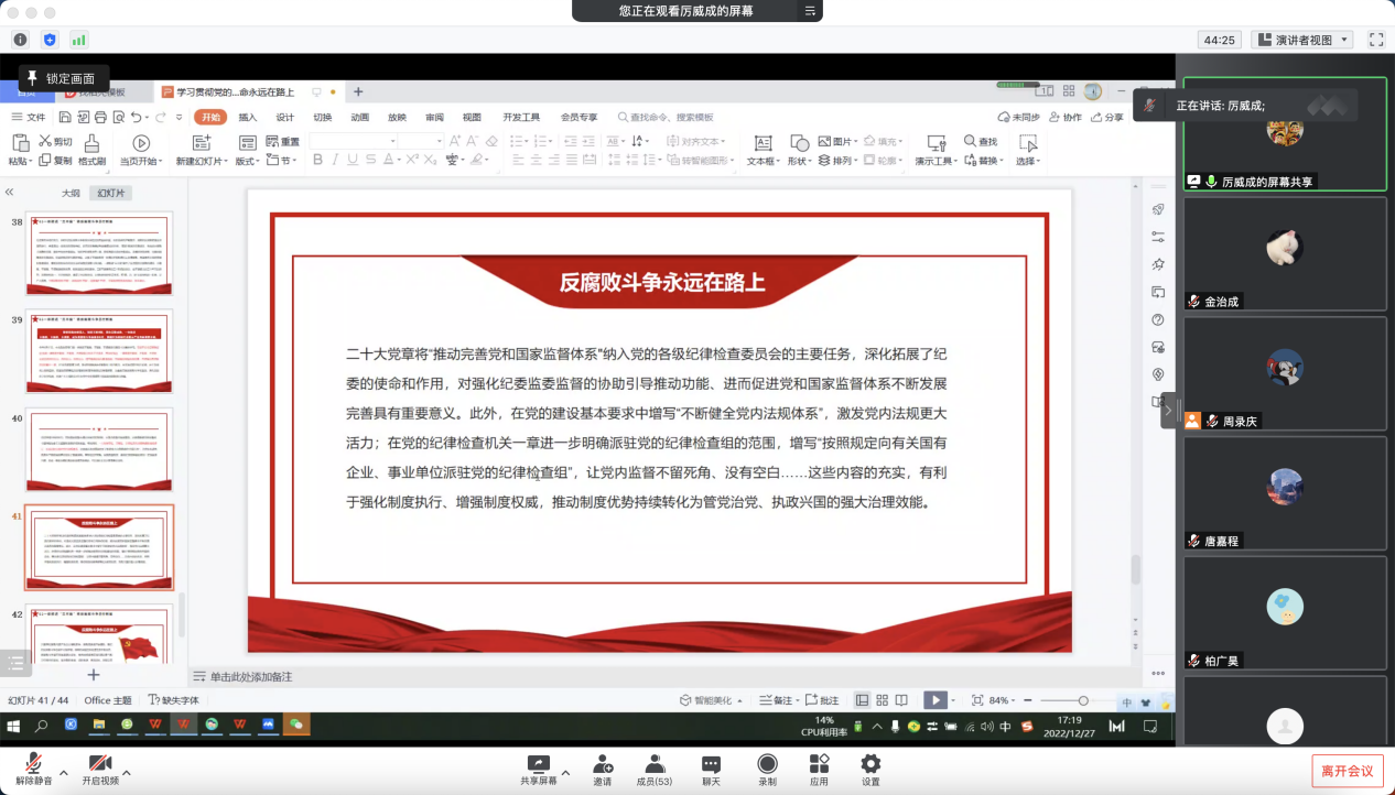 12月27日下午,疯AV 研究生第二党支部通过腾讯会议开展“学习贯彻党的二十大精神”主题教育专题党课。本次党课由学院党委副书记兼支部书记厉威成主讲,主题为《学习贯彻党的二十大精神——党的自我革命永远在路上》,支部全体党员及入党积极分子参加党课。