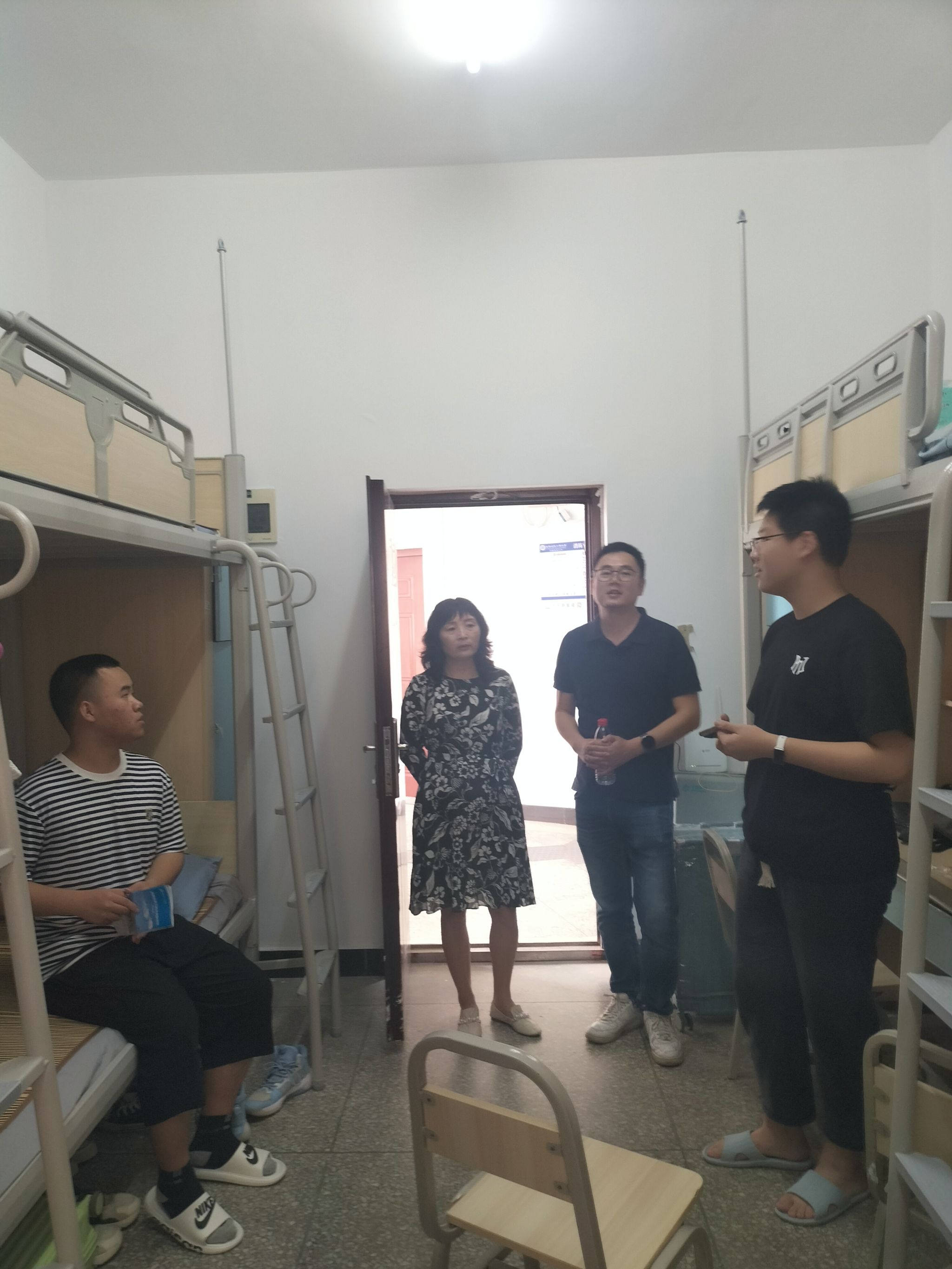 党委书记陈敏、党委副书记厉威成、团委书记岳旭媛在2023年9月5日上午走入新生寝室进行慰问。