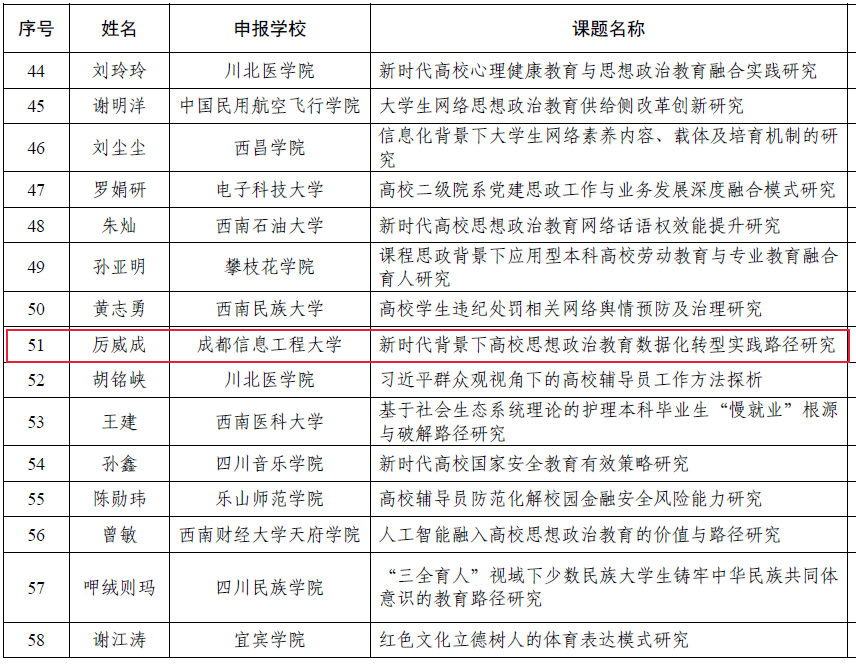 为了进一步提高学院辅导员思想政治教育理论研究水平与实际工作能力,推进辅导员队伍专业化培养和职业化发展,学院积极组织开展进行研究课题申报工作。2023年四川省教育厅、高校思想政治工作队伍培训研修中心(西南交通大学)思想政治教育研究课题(高校辅导员专项),共立项107项,其中,疯AV