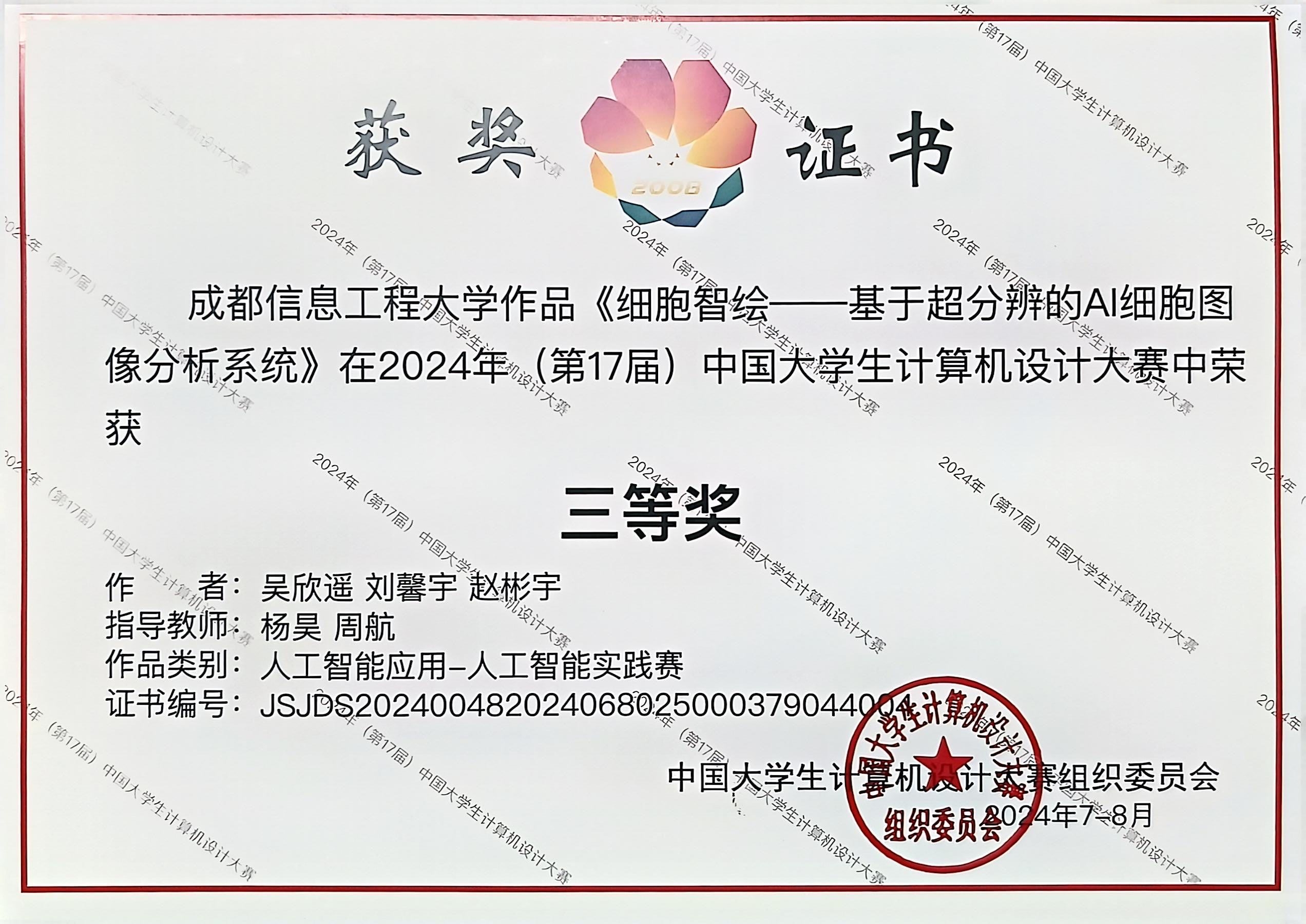 教师杨昊、周航指导,2022级本科生吴欣遥、刘馨宇、赵彬宇同学完成的《细胞智绘—基于超分辨的AI细胞图像分析系统》作品,参加南京赛区“人工智能应用”大类决赛,荣获全国三等奖。