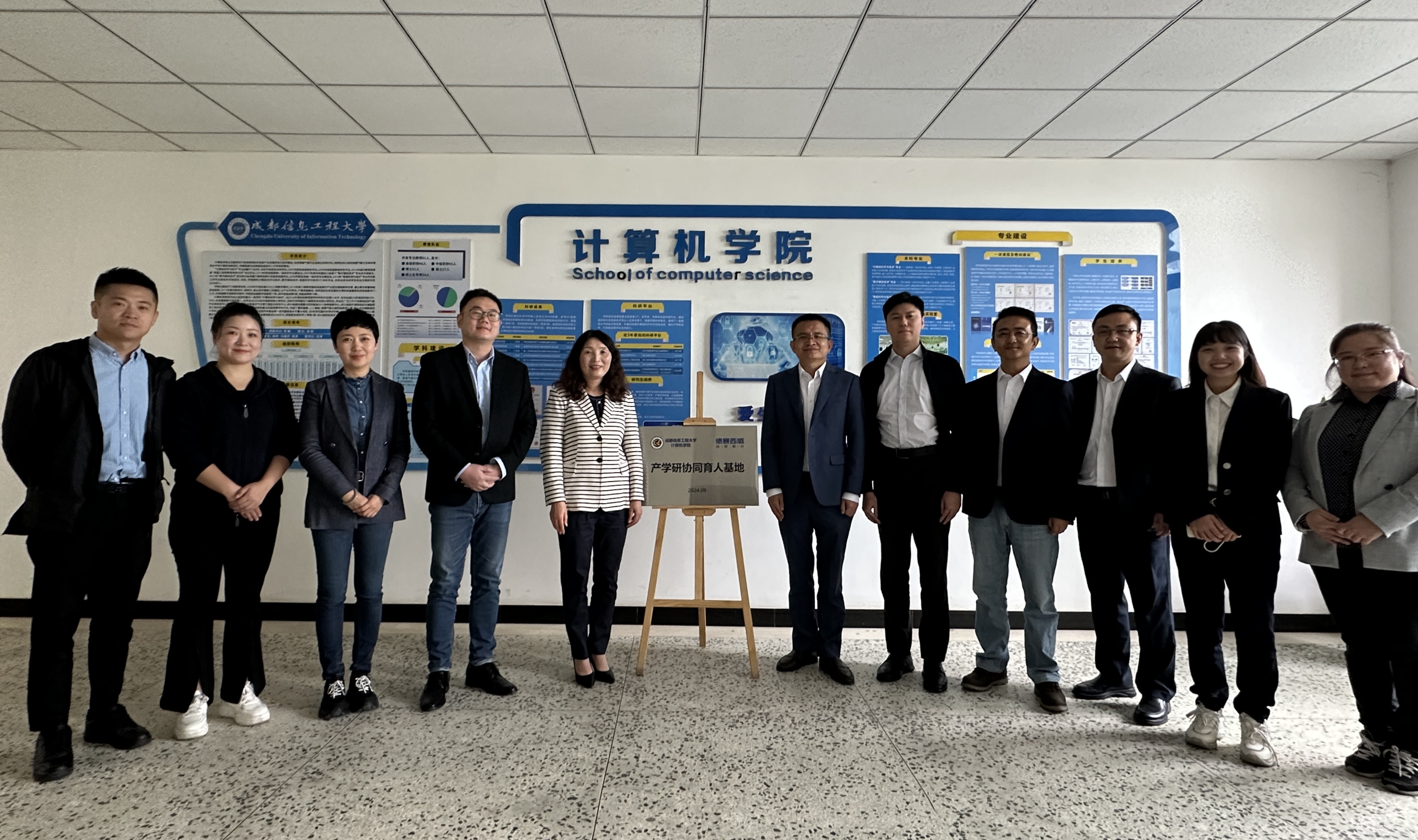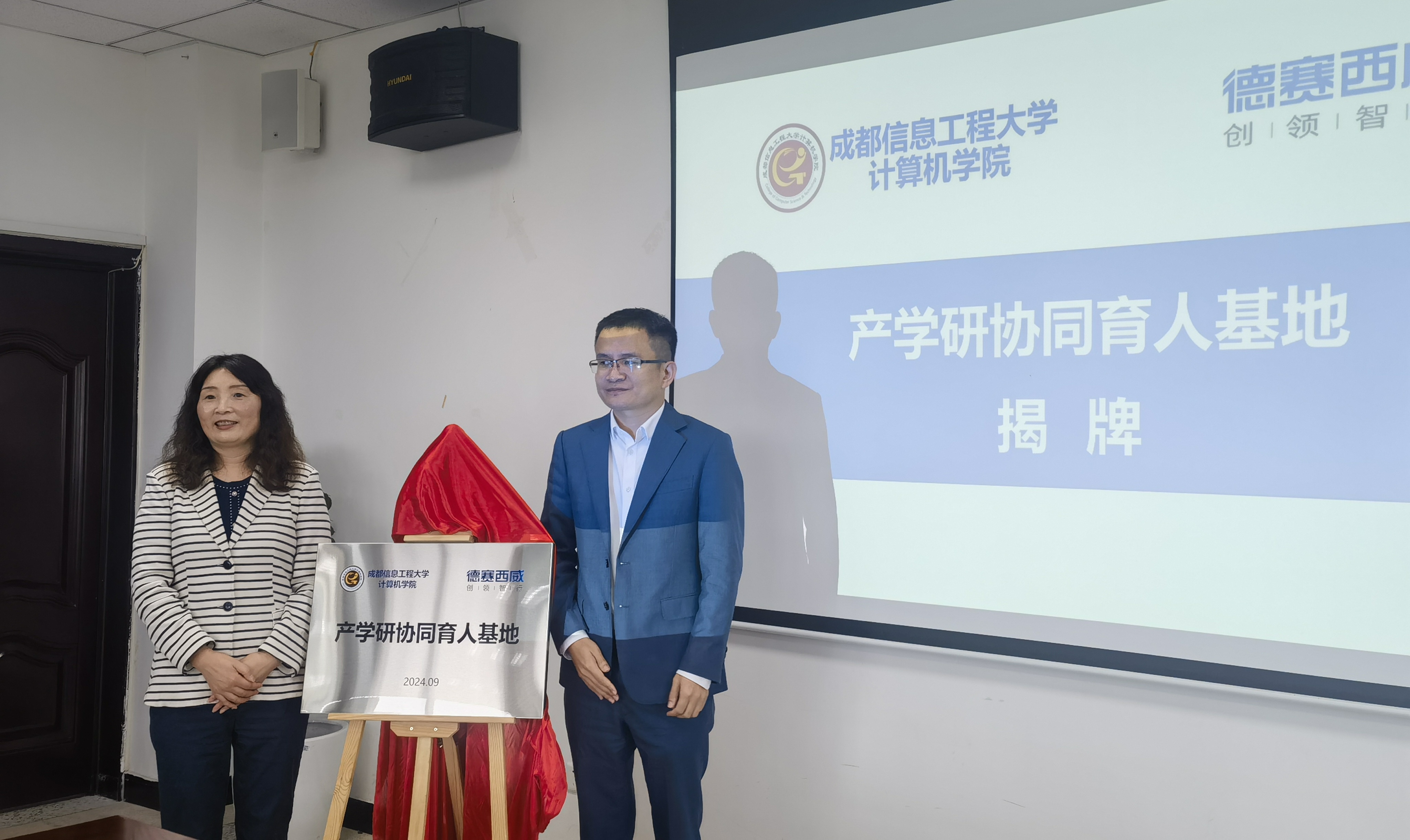 与德赛西威(成都市卡蛙科技有限公司)在信达楼A311举行了产学研协同育人基地揭牌仪式暨校企合作交流座谈会。学院党委书记陈敏、学院党委副书记倪涛,副院长朱烨、吴涛,德赛西威(成都市卡蛙科技有限公司)副总经理双建平、德赛西威中国区域人力资源经理翟晓敏、德赛西威(成都卡蛙科技有限公司)相关部门负责人以及学院教师代表参加了本次活动。