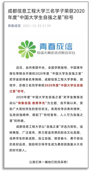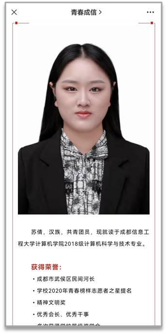 您所在的位置: 疯AV >> 党建工作 >> 团建工作 >> 团情快讯 >> 正文 团情快讯 2020年度中国大学生自强之星(志愿公益)——苏倩 疯AV 2018级本科生苏倩获评2020年度中国大学生自强之星(志愿公益)! 上一条:疯AV 在2022年“挑战杯”中国农业银行四川省大学生创业计划竞赛中再获佳绩 下一条:疯AV 在第七届“互联网+”全国总决赛再获佳绩 【关闭】