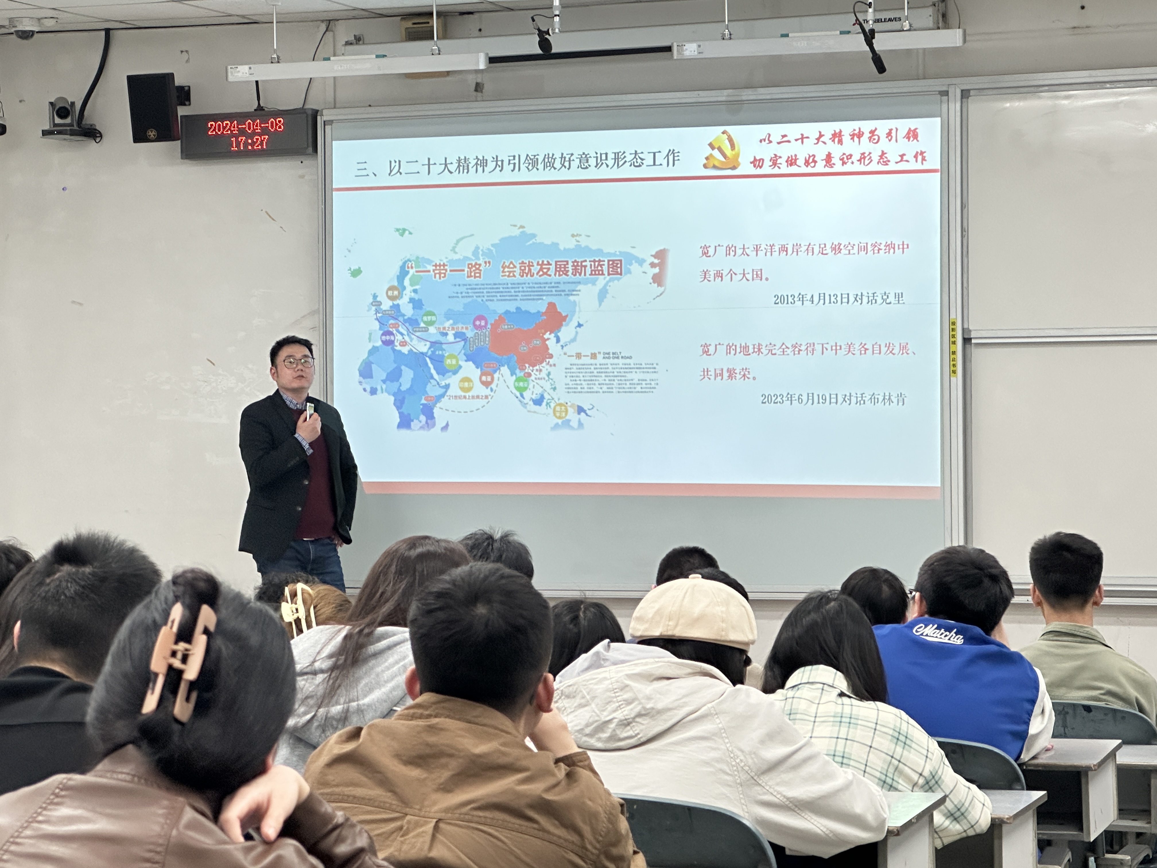 随后,厉书记就中国的世界地图与英国的世界地图的区别,娓娓道来英国作为亚欧大陆的一个岛国,在百年的历史长河中依据“大陆均衡”政策做出搅动风云的举动,从而引出意识形态斗争的本质即地缘政治的博弈,是利益之争,是政治斗争的工具之一。在厉书记的讲解下,让大家能将欧洲各国发展史,中东之乱,一战二战以及中国“一带一路”等各大历史事件串联一线,更加清晰明了国际形势。
