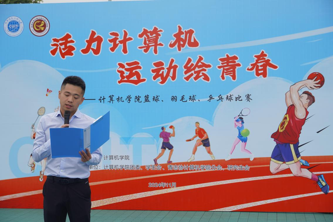 “活力计算机·运动绘青春”篮球、羽毛球、乒乓球比赛启动仪式在蓝球场举行。学院党委副书记、纪委书记倪涛、辅导员张梦琪以及各支报名队伍学生代表100余人参加了启动仪式。本次活动面向学院本科和研究生,旨在丰富同学们课余生活,促进同学之间的交流与友谊,提升大家的身体素质和团队协作能力。运动项目包括班级篮球赛,羽毛球男单、女单、混双,乒乓球男单、女单、混双等多个项目。