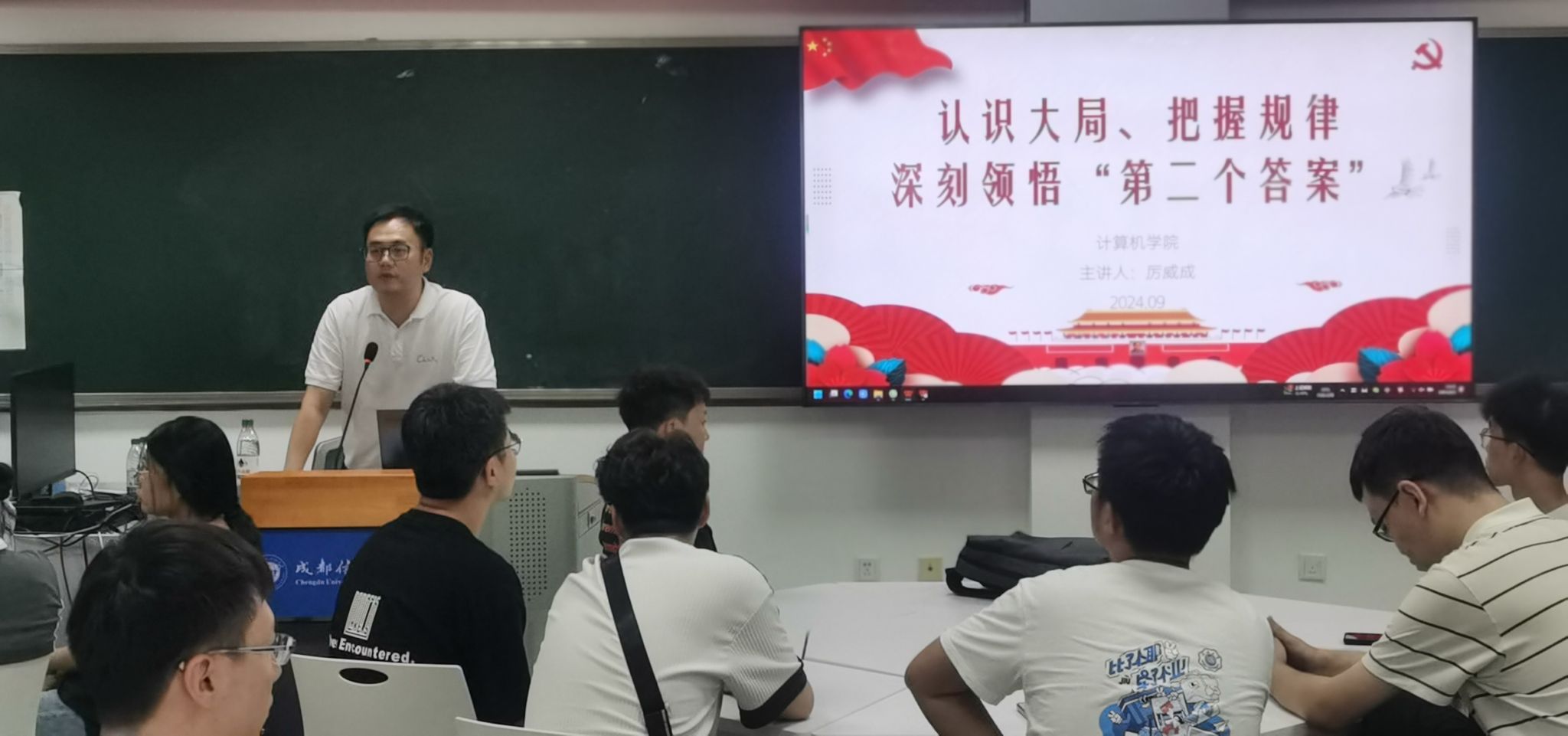 厉威成副书记在新生班会上以《认识大局把握规律 深刻领悟“第二个答案”》为题做分享,加强新生理想信念教育。厉书记通过生动的例子,深入浅出地阐述了马克思主义的真理性,鼓励同学们在日常生活和学习中要透过现象看本质,培养对社会问题的深刻理解。厉书记提到,作为未来的社会栋梁,研究生应具备正确的世界观和独立思考的能力,呼吁大家多读书,特别是哲学、历史和人文方面的书籍,以提高自己的认知水平。