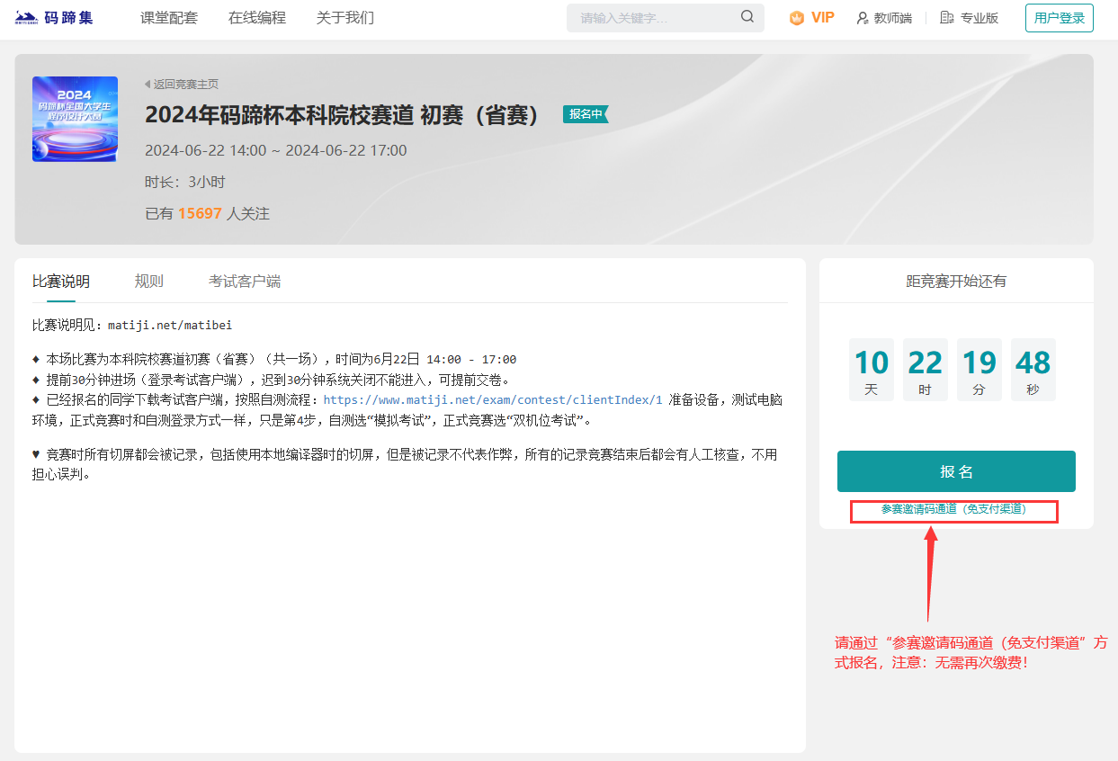 报名完成后,请密切关注“码蹄集”公众号的热身赛通知,以此熟悉相应线上监考环境和考试环境。